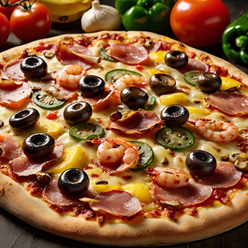 Experience the ultimate flavor-packed creation with our House Special Pizza! Topped with zesty pepperoni, savory ham, salami, and bacon, tender beef and shrimp, fresh mushrooms, green peppers, flavorful olives, crisp onions, spicy banana peppers, sweet pineapples, and juicy tomatoes. A pizza masterpiece made for every craving!